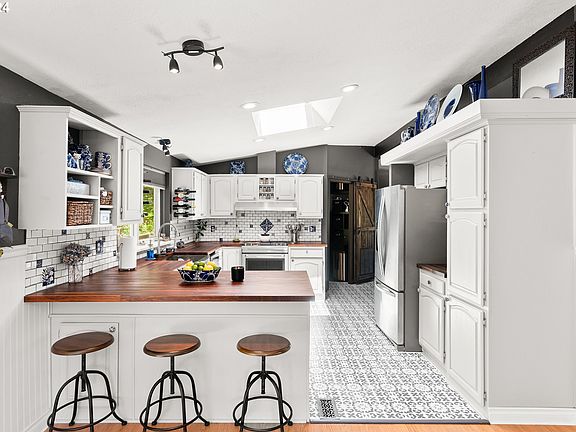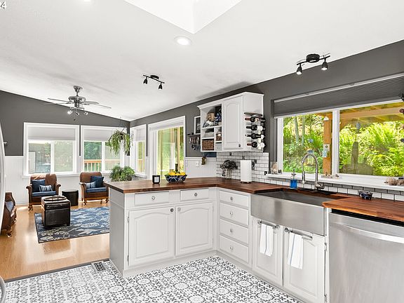 This 3-bedroom home is a serene retreat, nestled on a private acre. The kitchen, with its classic white cabinetry and custom butcher block countertops, exudes charm, while the stainless-steel appliances add a modern touch. Vaulted ceilings and bay windows framing mountain views create an atmosphere of spaciousness and tranquility. The primary ensuite, with its walk-in shower and slider to the deck/hot tub, offers a luxurious escape. The abundance of large windows seamlessly merges the indoors with the beautiful outdoors. The laundry room with built-in shelves adds convenience and organization. The manicured grounds, complete with a 24x30 shop with a loft and covered RV parking, provide ample space for hobbies and storage. The covered back patio with a built-in table for grilling is perfect for enjoying outdoor gatherings. This is a dream home!