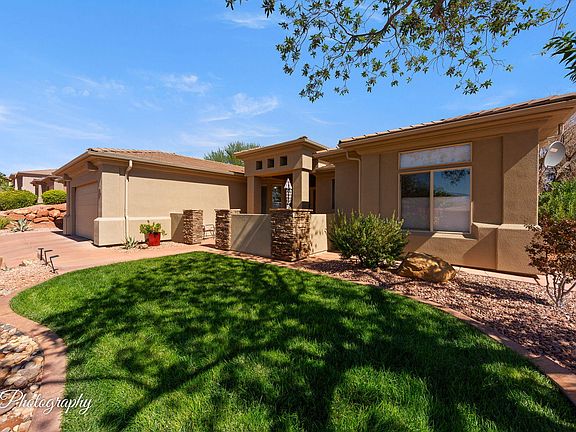 Beautiful 3 bed, 2 bath, plus den home in Prestigious Paradise Canyon community. Located minutes from exploring the trails of St George, Utah. This quiet community offers 3 swiming pools (2 outdoors, 1 indoor), 2 spas, clubhouse and woorkout room. Experience 1 level living with a 3 car garage and enclosed storage cabinets. The front patio and large back patio, with private back yard, are perfect for entertaining or family gatherings.The designer kitchen has glazed alder cabinets and granite etched counter tops.The kitchen island with seating has a ample dining area. Step into the great room with a unique rock wall and built in display cabinets. This beautiful upgraded home has high ceilings throughout. The entry hall opens into a spacious living room with double doors leading to a den/office. The large master suite has a curved wall of windows that draws in the desert scenery. The tiled master bath has both a jetted tug, shower, double vanity, and walk in closet. The large front bedroom has ample space for a king-sized bed and bunkbeds. The third bedroom and hall bath are comfortably sized. The laundry room has built in cabinets and drawers and desk/folding table. The house has been remodeled with LVP wood flooring, moldings, and updated carpet throughout. All fans and lighting fixtures have been upgraded. The window coverings are all customed designed. The dishwasher and water heater are new. Don't miss this stunning home in Paradise Canyon!