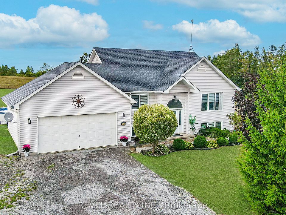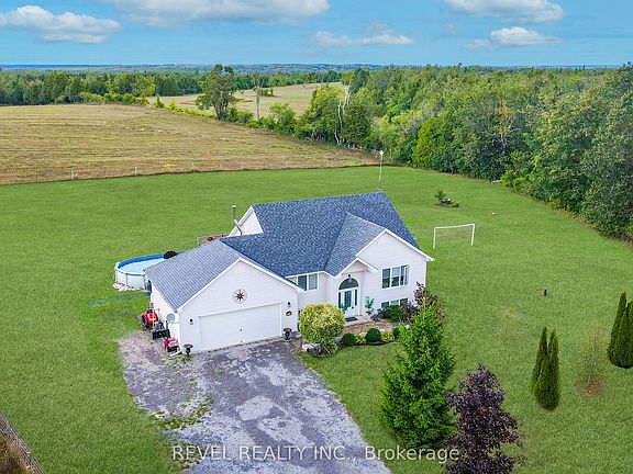 Welcome home to this beautifully crafted 5-bedroom, 3-bath raised bungalow, built in 2006 and set on a private 1.89-acre country lot. A large driveway and inviting entrance welcome you into this thoughtfully designed home. The open-concept main floor is perfect for modern living, featuring a bright chefs kitchen with pantry, coffee bar, and walkout to the back deck, seamlessly flowing into the dining and living areas. The grand primary suite offers its own private ensuite for comfort and relaxation. The finished lower level is ideal for family gatherings and entertaining, complete with a spacious rec room, full bar, three additional bedrooms, and a 3rd full bath. A combined laundry/utility space and convenient walk-up access to the attached garage add to the homes functionality.Step outside and enjoy evenings on the deck overlooking fields with no neighbours behind perfect for summer fun in the above-ground pool and watching picturesque sunsets. Centrally located just minutes from Lindsay and Peterborough, this property offers the best of country living with easy access to town amenities. Make this your next family home and start creating lasting memories here!