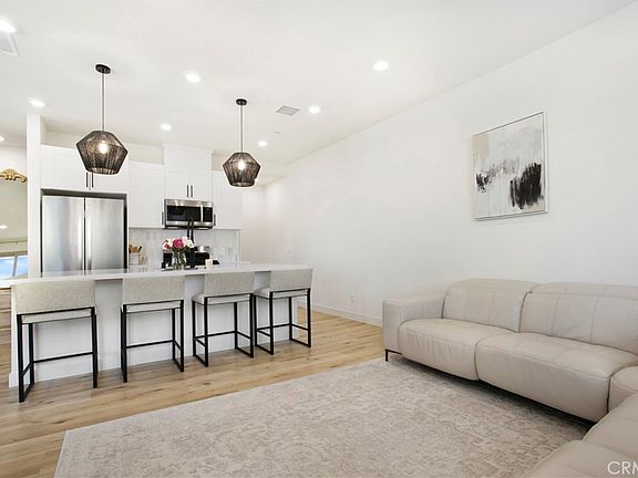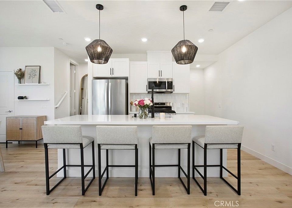 Welcome to the beautifully designed town home located in the Hudson gated community of Placentia. Newly built at the end of 2022 with an inviting open floor plan that features upgraded luxury vinyl flooring, high ceiling, recessed lighting throughout the home, dual-pane windows and sliding door that leads to the balcony, perfect for outdoor sitting, a walk-in pantry to store snacks, kitchen island with quartz countertop equipped with a single bowl sink and tiled marble back splash offering a clean aesthetic to the white shaker cabinetry matching cohesively with powder room. This turn-key home was thoughtfully built for energy efficiency featuring solar panels, a tank-less water heater, enhanced insulation. Enjoy the convenience of smart home features - garage opener, connected thermostat and smart door. Located on the third floor you'll find all generous sized bedrooms, laundry area and a linen closet. Primary bedroom features a walk-in closet, en suite bathroom includes a step in shower with glass, tiled flooring, quartz counter top. Two-car garage, direct entry with plenty of space for storage. Community offers, BBQ area, fire-pit to hang out, Playground for tot lot, Basketball Court and Dog Park. Conveniently located near shopping centers, restaurants, 91/55/57 freeways and walking distance from schools.