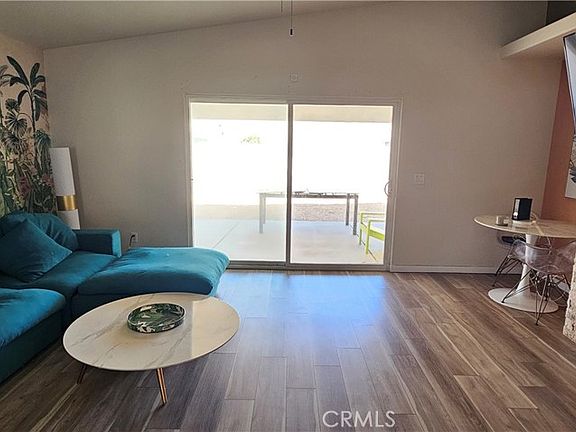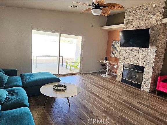 Discover the potential of this charming Palm Springs home! Situated on a 6970 square foot lot, this 1458 square foot single story home offers 4 bedrooms and 2 bathrooms, providing the ideal balance of comfort and functionality. The property boasts an attached 2 car garage, amazing mountain views, possible RV parking and attractive curb appeal highlighted by mature trees and low maintenance rock landscape. Upon entering, you will be captivated the open floor plan with laminate wood flooring throughout the entire home. Immediately on your left is a bedroom boasting laminate wood flooring, decorative walls, a walk in closet and two large windows filling the room with natural light. The spacious living room taking center stage, featuring a cozy wood burning fireplace and an abundance of natural light from the sliding glass door which leads to the backyard. The kitchen boasts abundant cabinetry, generous counter space, and a spacious walk-in pantry for ample storage. While the stainless steel appliances, including a 4-burner stove and oven, microwave and dishwasher, make cooking a breeze. Down the hallway you will find the master suite, additional bedrooms, a bathroom, a separate laundry room and a door providing direct access to the garage. The hallway bathroom features a shower tub combo and a single sink vanity with storage. The master bedroom offers a peaceful retreat, featuring a stylish accent wall, a spacious closet, ceiling fan, and a sliding glass door that fills the room with natural light while providing direct access to the backyard. The master bathroom features a shower tub combo, dual sink vanity with a stylish accent wall, ample counter space and cabinets. The additional bedrooms are equally spacious and comfortable, boasting laminate wood flooring, stylish accent walls, windows, ceiling fans, and closets. Outside, the backyard presents a blank canvas for your personal touches and landscaping preferences. The covered back patio provides a perfect setting for entertaining guests or enjoying outdoor meals. While the low maintenance desert rock landscaping ensures effortless upkeep, the spacious side yard offers possible RV parking, adding extra convenience and versatility. Whether you're looking to create a garden, add a play area, or simply enjoy the open space, this backyard is ready for your vision. The home's location is convenient, with shopping centers, freeways, and highways nearby.