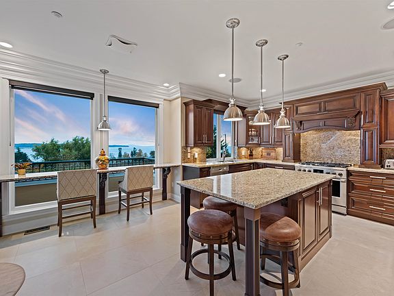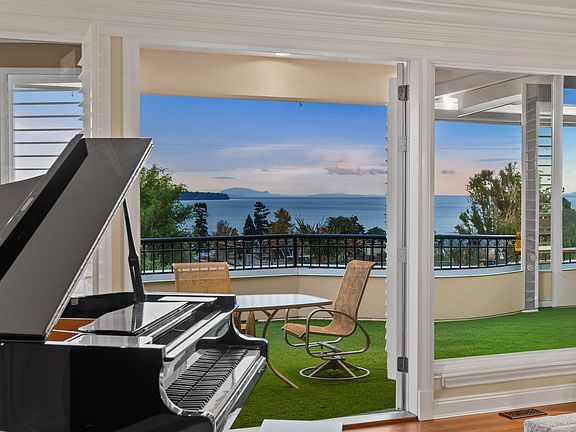 A Spectacular Custom-Built Hillside Oceanview Estate showcasing exceptional craftsmanship and scale. Spanning three levels with 4 bedrooms and 4 bathrooms, this stunning property offers panoramic ocean and Mt. Baker views. Blends timeless design and modern comfort. Upper level features a grand living room with fireplace, chef-inspired kitchen, ocean vistas, media room and flexible bed/office. Main level offers two bedrooms including the primary with a spa-inspired ensuite and access to a spacious ocean view terrace. Lower level includes a well-appointed one-bedroom self-contained suite. A/C, new furnace, solar panels, along with numerous high-end upgrades totaling approximately 500K invested into the property.