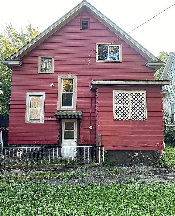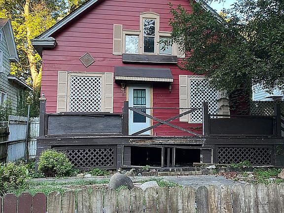 House Needs work, was a two apartment house, it has two bathrooms two kitchens, downstairs has living, dining, two bedrooms, small kitchen and dinette area, and bathroom, upstairs has living area 2 bedrooms full bath and kitchen. Has full basement unfinished. The garage is a 4 car garage alley access driveway and front street parking. Has large fenced back yard and fenced in front yard. House has working furnace but no electrical box, needs plumbing work and remodeled. Has aluminum siding. House needs a lot of work but definitely could do enough work to move in and work around it, it is in need of interior remodeling in downstairs kitchen and bathroom selling due to death in family.