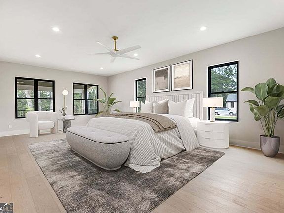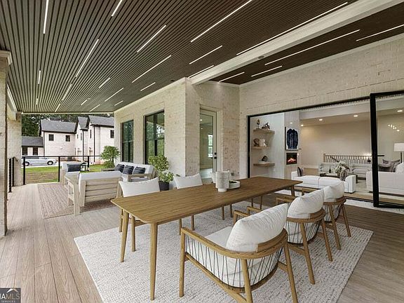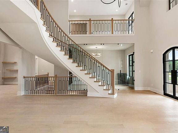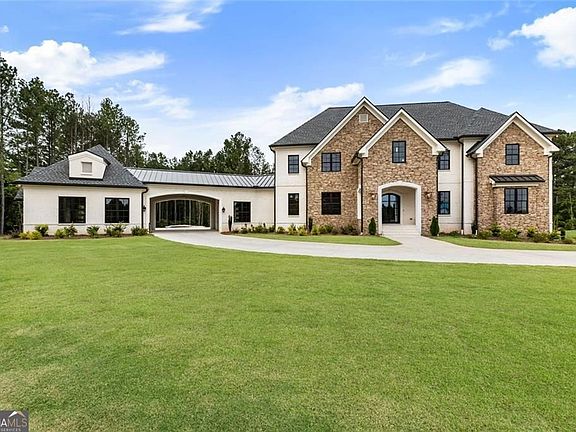 Thompson Manor delivers a rare combination of high design, privacy, and freedom-set on 1.63 acres in Milton with NO HOA. This property offers the flexibility to add a pool, pool house, or even expand the motor court, which already accommodates guests and collectors with ease. Step through dramatic iron and glass double doors into a home defined by soaring ceilings, bold architectural lines, and magazine-worthy design selections. The two-story living room makes a striking first impression with a sculptural curved staircase and walls of windows that flood the space with light. The chef's kitchen is both a showpiece and a workhorse, featuring custom European-style cabinetry, quartz backsplash, a waterfall-edge island, Thermador 48" range, and paneled refrigeration. The space flows effortlessly into the dining area and grand room, where a floor-to-ceiling Quartz linear fireplace, wood-beamed ceiling, and built-in wet bar elevate entertaining. Folding glass doors extend living outdoors to the covered porch with its own fireplace and grill connections. The main-level owner's suite is a private sanctuary, opening to the porch and featuring a spa-inspired bath with dual rainhead showers, floating vanities, illuminated mirrors, a freestanding soaking tub, and luxe marble finishes. A custom dressing room with integrated laundry adds both style and function. Upstairs, three en-suite bedrooms include two with private balconies. A bonus room offers flexibility as a fourth suite, while a secondary laundry with custom built-ins keeps everything organized. Additional features include wide-plank hardwoods, a walk-in pantry, mudroom with custom storage, EV-ready three-car garage with epoxy floors and pet wash station, and a porte-cochere for dramatic curb appeal. The detached garage has room for a car lift. The unfinished terrace level provides room to grow with space for a gym, theater, or guest suite. Located in one of Milton's most desirable areas-with award-winning schools and close proximity to Crabapple, Alpharetta, Avalon, and GA-400-this home delivers a refined lifestyle without the restrictions of an HOA.