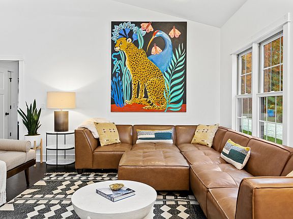 The spacious kitchen is highlighted by a large granite island, high-end appliances, and a stylish bench-seat breakfast nook. A large, cozy porch with wall-to-wall windows and fashionable couches, chairs, and a "picnic table" provides you with great views of the massive backyard and surrounding trees.