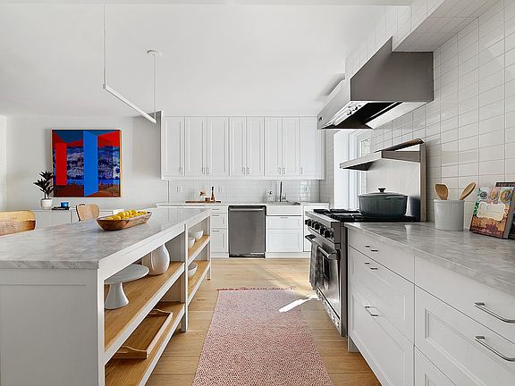The airy garden level with exterior and interior access presents an open living/dining room enriched by a fireplace for relaxing and entertaining. The sunny open kitchen that adjoins was impeccably renovated, appointed with sleek white cabinetry, Carrera marble countertops, a white tile backsplash, a large center island with open storage, and premium appliances for the seasoned cook including a Sub-Zero fridge, Bosch dishwasher and 6-burner Viking stove with a fully vented hood. On this level you’ll also find the mechanical room plus additional storage, a vented washer-dryer, a windowed full bath, and entry to the expansive rear yard for private outdoor enjoyment. Details here include herringbone-laid bluestone, an antique brick walkway leading to the raised yard, lush plantings, cedar fencing, a retaining wall, and plenty of space for alfresco living/dining.