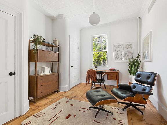The recently redone front garden, stoop and porch welcomes you to the gracious parlor level. Inside is a second living room with fireplace, a handsome office/den behind pocket doors, 10’ ceilings, and a full tiled, windowed bathroom. Up the stairs, the second floor is occupied by 2 well-proportioned bedrooms with ample closets, a full hall bath, and nursery/bonus area. The third level marked by 10’9” vaulted ceilings and enchanting skylights is reserved for the primary bedroom retreat with extensive closets, sitting and office areas, and a serene en-suite windowed bath with a claw-foot soaking tub, separate shower, luxurious tile and millwork. Other highlights include clever hidden built-ins and excellent storage.
