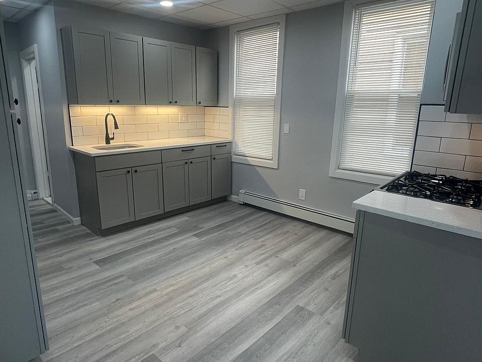 Kitchen with backsplashNew kitchen cabinetsRecessed lightingNew tiled bathroomNew flooring