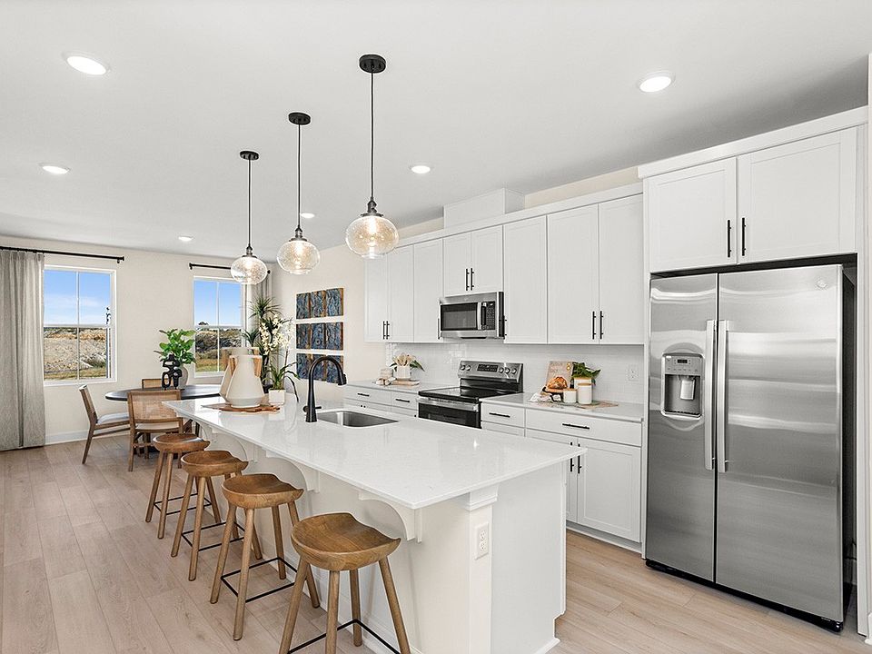Step into this beautifully crafted 4 Bed / 3.5 Bath “Kimberly” townhome featuring 9’ ceilings, 8’ doors, and an open-concept floor plan that’s equal parts stylish and functional. The kitchen is the heart of the home, showcasing white cabinetry, quartz countertops, stainless steel appliances, and a large island perfect for gatherings and fall festivities.