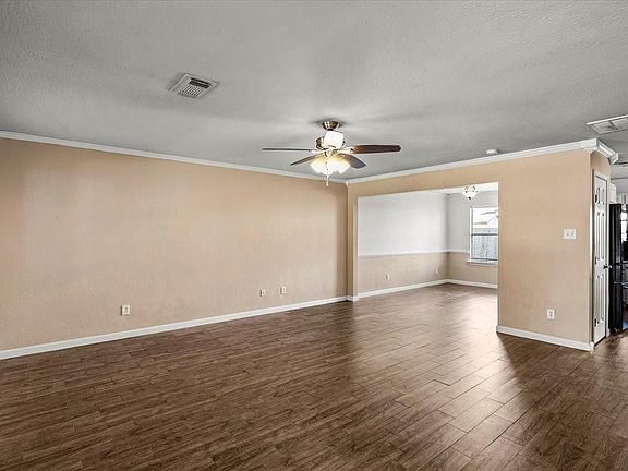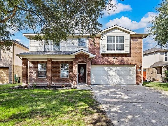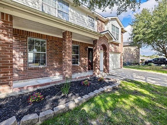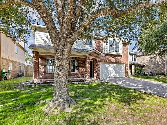 This beautiful brick-front residence offers impressive curb appeal with a covered front porch shaded by mature trees and a concrete driveway leading to a two-car garage. Inside, you'll find generous living spaces perfect for entertaining or relaxing with family. The open-concept layout connects the living room, dining area, and kitchen creating an inviting flow filled with natural light. The primary suite featuring a private bath and walk-in closet is located upstairs as well as the bedrooms are well-sized with ample closet space. At the top of the stairs is an additional space that can be used as a family room, play room or home office/study. The fenced backyard provides plenty of room for outdoor gatherings, pets, or a future garden. Conveniently located near I-45 for easy commutes to Houston or Galveston, this home is close to local parks, schools, shopping, and dining.