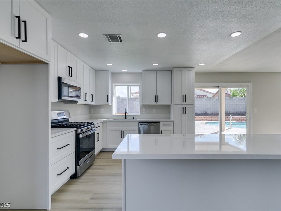 Enter this stunning renovation to an open concept floor plan pouring in natural light. From the front door and sliding glass door showcase a direct view to your new sparkling blue pool. NEW Dove Grey Shaker cabinets contrasted by matte black handles. Modern Quartz countertops, stainless steel appliances and recessed LED can lights. Bathrooms have been remodeled top to bottom. The curb appeal matches the interior with fresh paint in attractive contrasting colors. Warm luxury vinyl plank flooring that can withstand the family pool parties. Accented fireplace tile makes a bold unique statement piece. Freshly painted inside including upgraded 5" baseboards. New light fixtures inside and out, kitchen & bath faucets, door handles, ceiling fans, chandeliers, toilets, light switches, everything you need to be able to simply move in and enjoy all this incredible home!