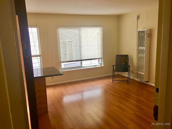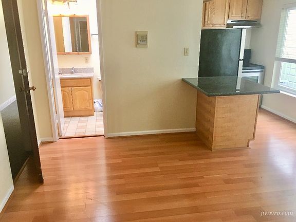 This apartment is in a well-maintained Noe Valley building. The living room is bright and open, featuring large windows that fill the space with natural light and provide a cozy, welcoming atmosphere. The kitchen includes an electric stove, oven, and a breakfast bar for two, plus a convenient corner nook that's perfect for dining or a small workspace. The bedroom features a full wall closet with sliding doors and plenty of room for comfortable living. The bathroom includes a shower-over-tub setup with updated fixtures.