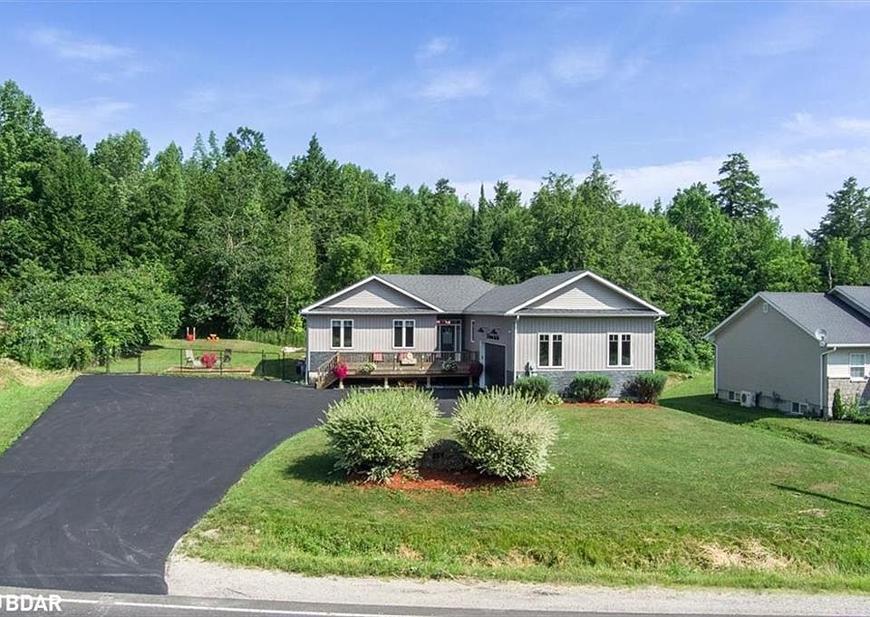 Welcome to this well-loved raised bungalow, constructed in 2016 and nestled in the peaceful, semi-rural community of Moonstone. Just minutes from the ski slopes of Mount St. Louis and surrounded by nature, this home offers the perfect blend of rural charm and modern convenience. Set on a private, treed 0.342-acre lot, the property boasts exceptional outdoor living with two spacious decks, a pergola, a Tiki bar, and an 8-person Arctic Spa hot tub (2021)—ideal for year-round enjoyment and entertaining. The double garage provides 524 sq ft of functional space, while the newly paved driveway easily accommodates multiple vehicles and all your recreational toys. Inside, the bright and open-concept main floor features a stunning great room with a cozy gas fireplace and rustic mantel. This great room seamlessly connects the kitchen and dining area. The kitchen is truly the heart of the home, showcasing timeless shaker-style cabinetry, gleaming quartz countertops, stainless steel appliances, a new upright freezer, and a center island perfect for meal prep or casual gatherings. A large pantry adds convenience and ample storage. Thoughtful lighting, stylish fixtures, and a warm, welcoming layout make this home ideal for entertaining. The main-floor laundry room, with a sink, also functions as a mudroom, offering direct access to both the oversized built-in garage and the fully finished lower level. Downstairs, the finished walk-out basement features large look-out windows, a second fireplace in the family room, two generously sized bedrooms, and a full 4-piece bathroom—perfect for guests or the teens. With the attached overhead projector & speakers, movie night will be memorable. With five bedrooms, three full bathrooms, and easy access to local schools, parks, and major city amenities (just 20 minutes away), this home has it all for ultimate family living. Whether you're an outdoor enthusiast or simply seeking a peaceful retreat, this Moonstone gem is not to be missed!