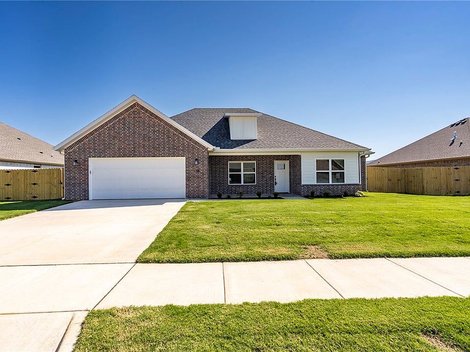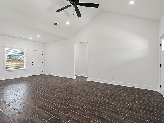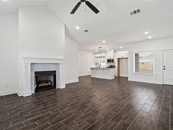 Split floor plan offers a private primary suite with dual vanities, a walk-in tiled shower, and generous closet space. Additional bedrooms are well-sized and versatile for any use. Open living area with vaulted ceilings, wood-look tile flooring, and a cozy fireplace. The chef’s kitchen boasts white cabinetry, granite countertops, subway tile backsplash, stainless steel appliances, and a spacious island with seating. The backyard is fenced with a covered patio, perfect for entertaining or relaxing. Home has Blinds, Gutters & Fencing.