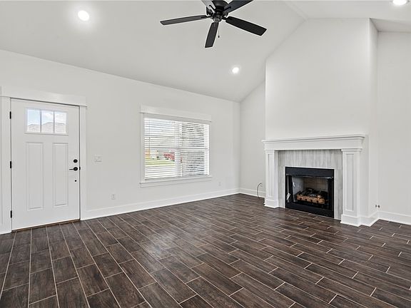 Private primary suiteGenerous closet spaceVaulted ceilingsCovered patioWood-look tile flooringDual vanitiesCozy fireplace