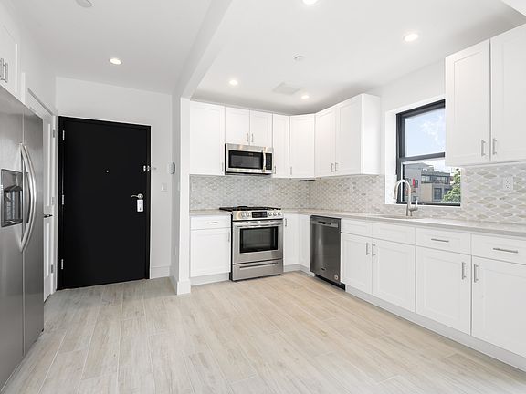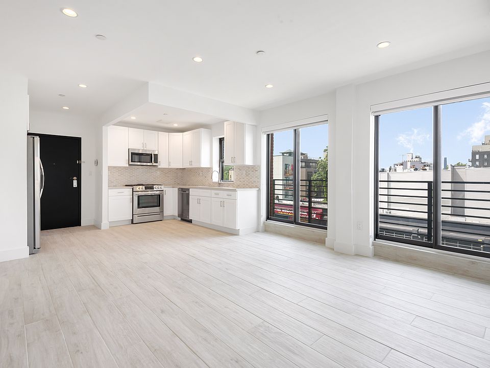 OPEN HOUSE Sunday 3-4pm, no appointment needed. This apartment is STUNNING. Featuring an expansive and bright open living room with four west-facing sliding glass windows, giving you plenty of natural light during the day and beautiful sunset light in the evening. The space is designed to fit an array of living room furnishings and entertainment center. The open kitchen is furnished with top of the line stainless steel appliances including a side by side fridge/freezer with auto ice; a five burner range with microwave; and a full size dishwasher. Granite countertops and abundant cabinet space make the kitchen both elegant and functional. Beyond the living room are the two bedrooms. The king-size bedroom, on the right, features a double door closet, en-suite bathroom with standup shower, and a Juliette balcony. The bedroom on the left is queen-size with space for a dresser and bedside table and also has a double-door closet. Both bedrooms have big North-facing windows and remote-controlled Mitsubishi A/C and heating units. The amenities continue with washer and dryer units just outside the apartment door and shared only with the tenant across the hall. Head upstairs and discover the two shared rooftops! The main rooftop spans half the building and gives West, North and Eastward views. This is an awesome area to lounge, barbecue and enjoy the Summer nights. For a bit more privacy, walk one flight up to the Crow's Nest, where you can enjoy even better views of Manhattan, Brooklyn and the stars. The location is ideal. Close to both McCarren Park and McGorlick Park and just a few blocks from all the shops, restaurants and nightlife of Nassau & Manhattan Aves. For those with cars or that hire cars, an entrance to the BQE is just down the street. Get in touch to schedule a private tour.