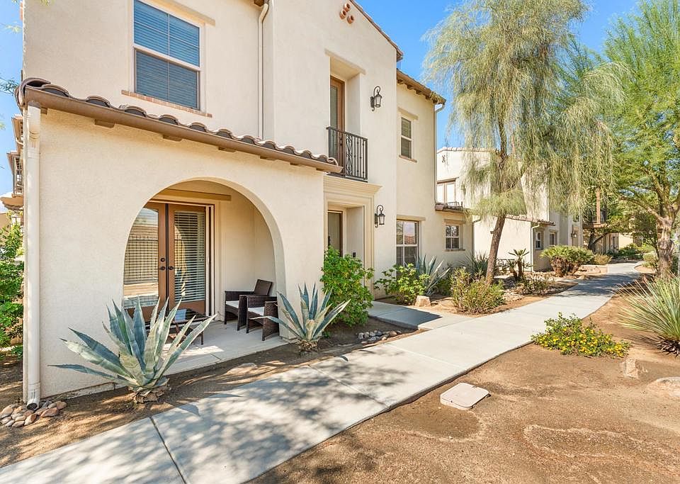 Welcome to Spanish Walk, one of Palm Desert's most desirable communities! Located minutes from, Disney Cotino, a short drive to world famous Coachella and Stagecoach Music Festivals, The Empire Polo Fields, Acrisure Arena, perfect for hockey, concerts, entertainment, and minutes from The Gardens on El Paseo where you'll find fine dining and shopping. This spacious two-bedroom, two bath condominium offers the perfect blend of comfort, style, and resort-style living in the heart of the Coachella Valley. Home features a modern kitchen, granite countertops, open floor plan, primary bedroom walk-in closet, and en-suite bath. This lower-level condo also offers a private patio directly off the living room that will expand you inside outside, perfect for entertaining. The home has an attached 2-car garage, and inside washer and dryer. This condo is located directly across from one of the many pools inside this beautiful community, that also offers a fitness center, walking path for your morning exercise and greenbelts. Whether you're searching for a fulltime residence, seasonal retreat, or investment property, this condo offers the ideal blend of resort style living in a prime desert location. Don't miss this opportunity to own a home in one of Palm Desert's most sought-after communities.