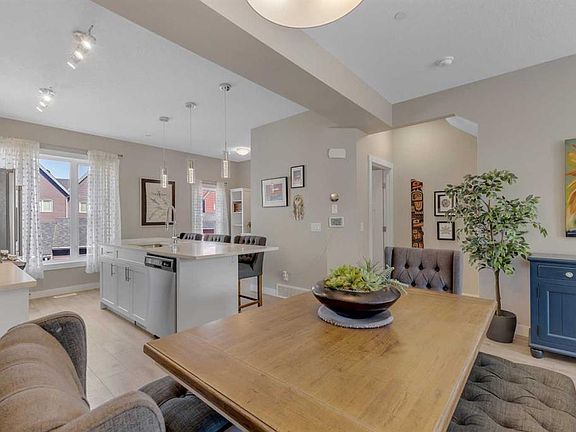 **OPEN HOUSE, SUNDAY, OCTOBER 26, 12PM TO 2PM.** Situated in the innovative and vibrant community of Livingston, this beautifully designed, open-concept home combines modern style with everyday comfort. Nestled in one of the most peaceful corners of the complex and overlooking a serene courtyard, this home offers its own private front-yard retreat. With 1249 sq. ft. of developed living space, high-quality finishes, and thoughtful upgrades throughout, this home is sure to impress. Bright and airy, the interior showcases oversized windows, 9-foot ceilings, and luxury vinyl plank flooring that extends gracefully through every room. The stylish kitchen is masterfully designed for efficiency and entertaining. Featuring premium upgraded quartz countertops, elegant herringbone tile backsplash, shaker-style two tone cabinets, stainless steel appliances including a gas stove, and a sprawling island. The kitchen flows seamlessly into a refined dining area and living room, centered around a cozy fireplace, ideal for entertaining and relaxation. A versatile flex space, perfect for a home office, and powder room complete the main floor. Upstairs, the second floor continues to impress with dual primary bedrooms, each with their own ensuite and walk-in closet. Enjoy the practicality of the upper-floor laundry room paired with extra storage space, keeping your home organized and efficient. Step outside to a spacious private patio complete with a cozy fire table, perfect for relaxing evenings or morning coffee. The double attached garage provides plenty of room for parking and storage, while the unfinished lower level awaits your personal touch. Just steps from your front door, the LIVINGSTON HUB offers endless recreation and fun for families. Enjoy the tennis courts, skate park, ice rink, playground, splash park, gymnasium, and a variety of community programming—everything you need to stay active and entertained.