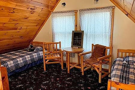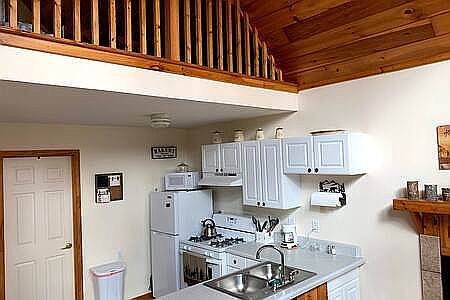 One Bedroom with a queen comfortable bed is downstairs as well as full bathroom and equipped kitchen.Open loft with two twin beds plus a work/study station.Central Air with cool and heat. Ceiling fans in living room and bedroom.Gas fireplace. Close to Carters lake and Fork Mountain park.