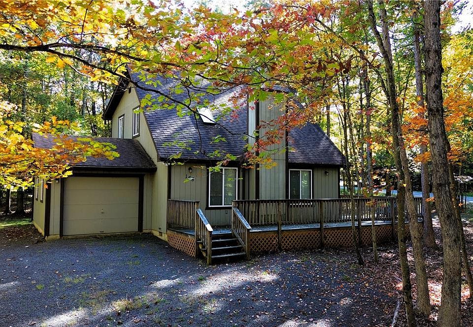 Tastefully decorated 3 Bedroom 2 Bathroom home nestled in Towamensing Trails! Features include a wraparound deck, updated kitchen with stainless steel appliances, dishwasher and propane stove, laminate floors throughout the main floor, a stone faced propane fireplace, first floor main bedroom with jack & jill access to the primary bathroom as well as an attached 1 car garage. The second floor includes two additional bedrooms, another bathroom and a loft overlooking the living room below. The property is oversized at 0.63 acres and is located on the corner of Towamensing Trail and Eliot Lane and is only 1.4 miles to the lake, beach, outdoor pool, and a clubhouse with its own bar and restaurant. Home comes fully furnished!