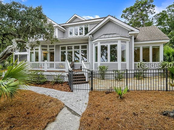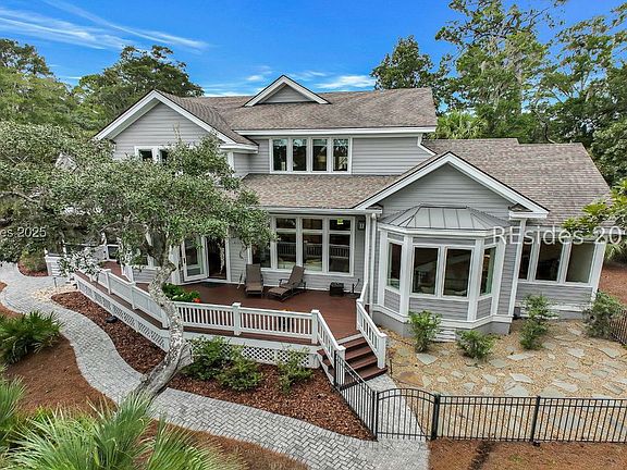RARE OPPORTUNITY! Experience miles of panoramic tidal marsh & deepwater views with this 2015 built residence by renowned custom home builder in private, amenity rich Moss Creek. Interior features/recent improvements include wood flooring, 10-20 vaulted/tray/coffered ceilings, 8 interior doors, millwork & extensive built-ins by master craftsmen, granite counters, designer curated fixtures/hardware/lighting/window treatments, 2 gas fireplaces, walls of windows (w/transom windows) to view, stainless steel appliance package, spray foam insulation, imressive storage space including walk-in attic, closets & garage w/extensive built-ins. Very livable floor plan offers island kitchen open to dining & great room, walk-in pantry, much desired screened porch, bonus/media rm, office/den (4th BR), powder rm, laundry/mud room, ample/well-appointed guest BR suites & expansive/private primary suite with updated 5 Star bath, large walk in closet + multi-purpose flex room. Exterior offers attractive/durable Hardie board siding, charming covered front porch, all new front yard & plantings, extensive rear decking & brick paver walkway, must have fenced dog run, low voltage path & uplighting, majestic live oaks & pebbled walkway to secluded marsh front firepit. All sited on high elevation, quiet/private, end of cul de sac lot with Blue Heron Sanctuary to front and preferred southeastern exposure to rear offering excellent natural light, picturesque sunrises, and stunning, shaded late afternoon/evenings great for relaxing and entertaining friends and family. This is the home you've been dreaming about...