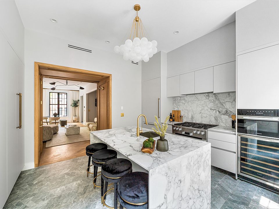 Masterfully renovated to perfection, the parlor floor boasts a living and dining area with both southern and northern exposures and features amazing soaring ceiling heights, beautiful white oak herringbone wood flooring as well as a powder room appointed with a marble vanity, black marble flooring with faucet in brass finish. The open concept state-of- the-art gourmet kitchen comes with all the bells and whistles combining brilliant engineering with vast customization.