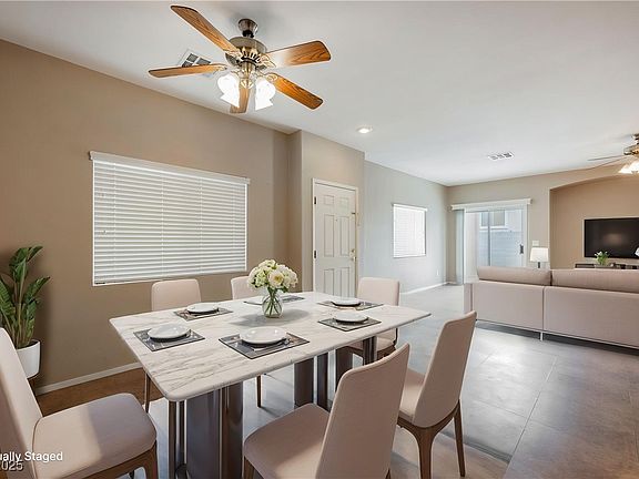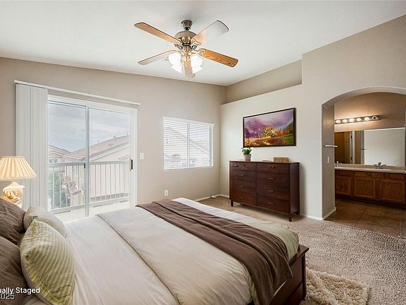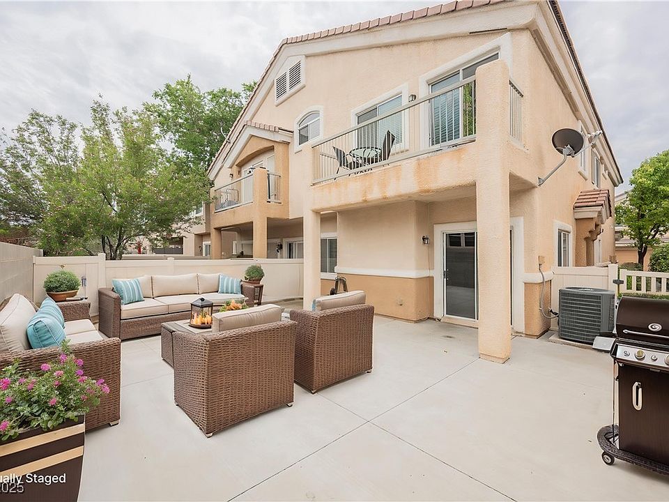 Charming 2-story townhome in gated Old Vegas Ranch! This 3 bed, 3 bath home offers 1,670 sq ft with tile flooring downstairs and cozy carpet upstairs. The spacious kitchen, large laundry room with extra storage, and ceiling fans throughout add comfort and convenience. The primary suite features a walk-in closet and a private balcony with stunning mountain views. Enjoy the covered patio in the backyard—perfect for relaxing or entertaining. Community perks include a pool, spa, park, playground, BBQ area, and skate park. With easy freeway access and just minutes from the River Mountain Bike Loop Trail, this home blends style, comfort, and location. Move-in ready!
