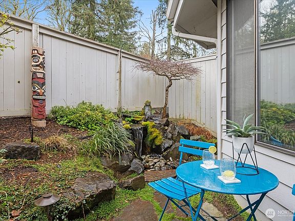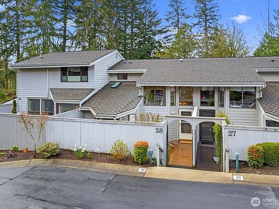 Welcome to this thoughtfully updated residence at Copper Tree in the Mill Creek Country Club. Spanning 1,586 sqft, this 2-bed, 1.75-bath home exemplifies NW living with an open layout, including a bedroom on the main floor. Updated laminate flooring guides you through the spacious main level with skylights, solar tubes and vaulted ceilings. Upstairs, the primary offers an opulent en-suite with double Corian vanities. Enjoy an indoor-outdoor lifestyle with a deck overlooking the greenbelt and a serene waterfall off the light-filled kitchen. Modern conveniences include a 2024 LG dishwasher, new furnace, and efficient mini-split system. Tranquility abounds in this serene setting, complemented by trails and proximity to Mill Creek Town Center.