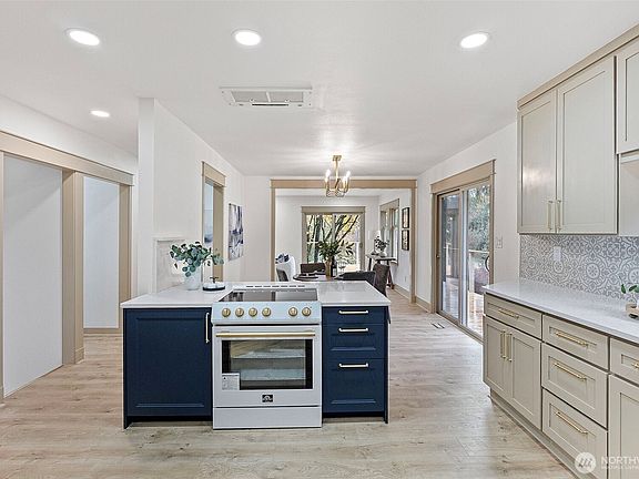 Stylish wet barStunning kitchenFinished basementStatement islandWarm wood tonesExtra living spaceLarge detached three-car garage