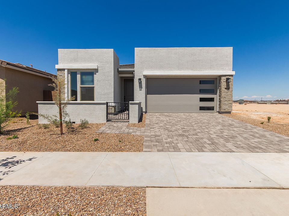 Explore this thoughtfully designed Sapphire floorplan featuring 4 bedrooms and 3 bathrooms. This home includes a teen room, a modern contemporary exterior, and a functional open layout. The beautiful kitchen offers a gas stove, quartz countertops, stainless steel appliances, 42'' upper cabinets, a tile backsplash, and a walk-in pantry. The spacious primary suite includes dual walk-in closets, dual sinks, and a separate water closet in the bathroom. Additional features include stone tile flooring throughout with carpeted bedrooms and ceiling fan prewiring in select rooms. The Ballpark at Avion community offers amazing amenities for just $107/month, including: Resort-style pool, pickleball courts, walking trails, parks and grilling ramadas. The neighborhood is located within walking distance to 2 major league baseball spring training facilities. Residents also enjoy easy access to more than 50 restaurants and lots of shopping within 3 miles.