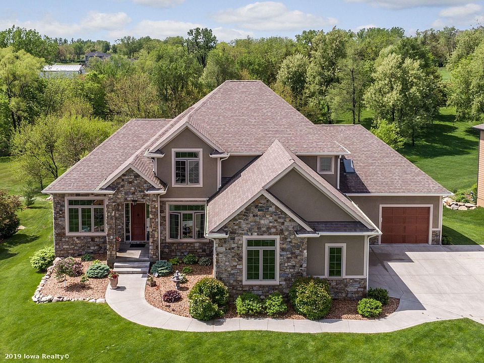 4,941 SF 1 ½ story home, on a .84-acre private park-like lot, with 5 BRs, 3.5 baths, 4-car garage including a rear garden garage. The first floor has an impressive entry, formal dining room with beamed ceiling; office with beamed ceiling, wans-coting and built-ins; larger family room, with stone front gas fireplace and built-in TV space; kitchen with maple cabinets, island that seats 4; master bedroom with a view, recessed ceiling; master bath with 2 sinks, separate tub and tile shower. The second floor has 3 BRs, 2 bath and a loft for study or play. The walk-out basement has lots of family and entertainment area including a family room, walk-behind wet bar, space room for a game tables, a theater room, exercise room and full bath 5th bedroom. There is a deck with concrete tile and large patio with fire pit.