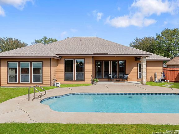 Welcome to your dream home! This move-in-ready gem was custom built and designed to blend comfort with style. The expansive open-concept family room flows seamlessly into the eat-in kitchen, perfect for hosting gatherings with family and friends. The heart of the home is undoubtedly the kitchen, featuring granite countertops, custom cabinets, and built-in stainless steel appliances. At the rear of the home, your serene primary bedroom awaits, complete with a luxurious ensuite bathroom featuring a separate tub and shower, dual vanities, and a walk-in closet. 10-foot ceilings and numerous windows with 2-inch wood blinds create an airy and inviting atmosphere throughout the home. Enjoy your inground pool, oversized rear covered patio, and fenced yard. Conveniently located just minutes from JBSA - Randolph, shopping, dining, I35 & Loop 1604. This home is wheelchair accessible with wider doorways and hallways, and grab bars in the primary bath.  The finished workshop has central AC & heating and is perfect for crafts or storage.  Live Oak Hills is a community of custom built homes with NO HOA.