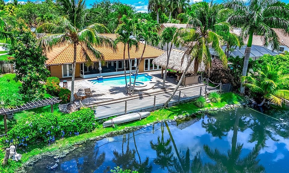Designed for entertaining and relaxation, this 4 bedroom, 3 full bathrooms waterfront Jacaranda Lakes home offers space, style, and serenity. Situated on an oversized lot of 12,004 sqft, the backyard retreat features a tiki hut with electric, outdoor kitchen, tv, pool, and hot tub—all with tranquil water views. Inside, enjoy a stylish bar lounge, dedicated coffee & tea station, impact windows and doors, 2025 water heater and pool pump, two A/C units, security cameras with DVR, and an S-tile roof. Primary bathroom is a cabana bath, 2 large walk-in closets, and a dressing area connecting the primary bedroom suite. Home has a versatile layout making it easy to spread out or come together. Don’t miss this unique blend of comfort and lifestyle in one of Plantation’s most loved neighborhoods.