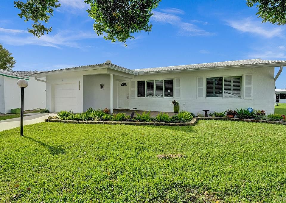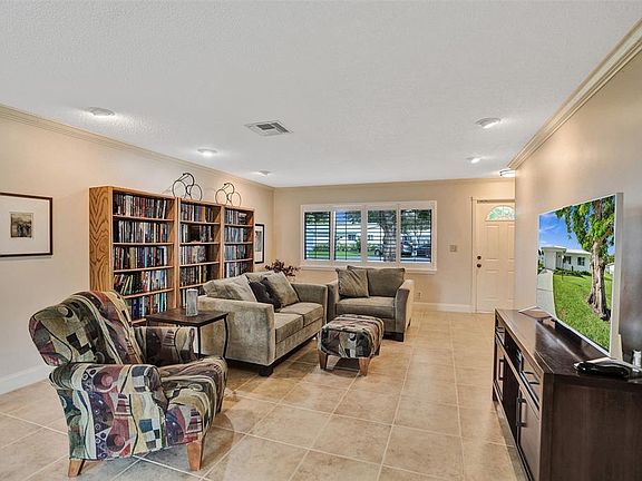 **VIEW 3D VIDEO***VA APPROVED**This beauty is a 2 bedroom, 2 bath home w/a one car garage on a cul-de-sac, along w/a very spacious dining room & family room. Great home to downsize & retire in! Beautifully maintained home w/tile flooring throughout, Plantation Shutters on all impact windows, & and crown molding in the living room. The kitchen has SS appliances, oak cabinets, stone backsplash, and a breakfast nook. Both bathrooms also have oak cabinets. The roof and W/H were replaced in 2023, and the A/C was replaced in 2019. The home has impact windows throughout and shutters for the front door and the garage door. New Circuit Breaker panel in 2024. Assoc requires 20% down & a 720 credit score (1 person only) . Assoc covers roof, internet, courtesy bus, lawn serv, and so much more.