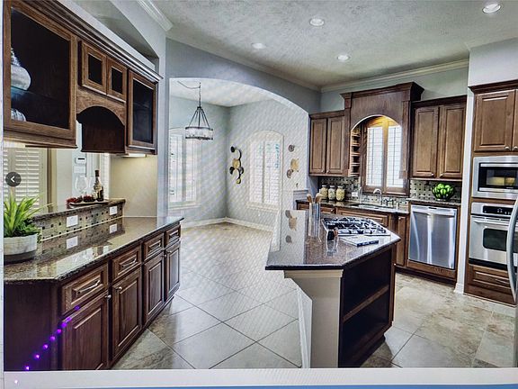 Cul-de-sac street.8'door.High ceilings.Wood floors in entry,family room,f.dining & 1/2 bath.Tile in kit,break,utility,baths.Plantation shutters&2'wood blinds.Lrg.secondary bedrooms w/walk in closets.3 car garage.Island kit w/granite counters.Huge mst.bedroom w/sitting room w/fireplace & dble doors leading to backyard & Covered outdoor patio.Mst.bath is awesome!Huge jacuzzi tub,Dble walk in shower,His/Her walk in closets,granite counters.Iron stair rails.