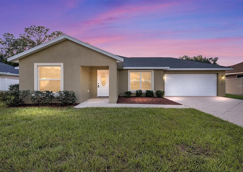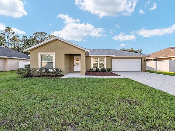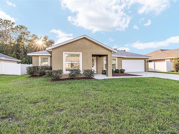 BETTER THAN NEW! This stunning 3-bedroom, 2-bath home built in 2021 offers an OPEN FLOOR PLAN with thoughtful upgrades throughout. Inside, you’ll find DESIGNER CERAMIC TILE in the main living areas and bathrooms paired with WATERPROOF LUXURY VINYL PLANK in the bedrooms—NO CARPET ANYWHERE! The interior has been FRESHLY PAINTED in a neutral palette and features UPDATED DORRS AND LIGHTING that give the home a clean, modern feel. The kitchen is a showpiece with SOFT-CLOSE CABINETRY, UNDER-CABINET LIGHTING, and a spacious bar for casual dining and entertaining. The primary suite includes a WALK-IN CLOSET with modernized sliding barn door, while both guest bedrooms offer large BUILT-IN CLOSETS, giving everyone plenty of storage. Soaring VAULTED CEILINGS enhance the main living area, and a TRAY CEILING in the primary suite adds an elegant touch. Outside, enjoy your covered back porch, NEW VINYL PRIVACY FENCING, and CUSTOM FIREPIT area—perfect for gatherings or quiet evenings. Additional highlights include a 2-car garage, convenient location near The Villages and Lake Weir, and the freedom of no HOA fees.