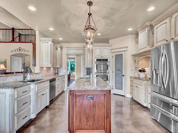 The open-concept layout features soaring ceilings, stained concrete floors, large windows, and custom built-ins throughout. The chef’s kitchen includes granite countertops, stainless steel appliances, oversized island, and a walk-in pantry with floor-to-ceiling storage. The main-level primary suite offers a spa-style bath with whirlpool tub, walk-in shower, and large closet.