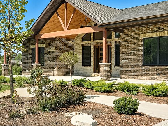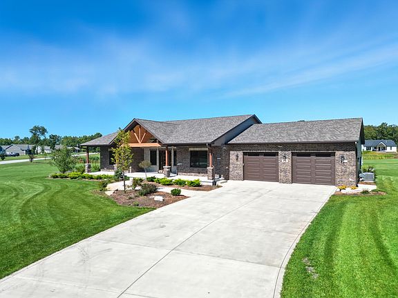 Stunning custom built ranch home is nestled on a sprawling 1.75 acre lot, offering breathtaking views of serene pond. The covered front porch is the perfect entrance to all the quality craftsmanship that awaits inside! The impressive vaulted ceilings adorned with rustic wood beams add character and elegance to the living space, showcased by hardwood floors throughout enhancing the overall ambiance. The front glass door allows for light to pour in! Double back sliders lead to covered back porch with fireplace for unlimited relaxing eves or mornings! Chef's kitchen with all appliances , pot filler & walk in pantry. Master suite has spa like bathroom with separate stand alone tub and walk in shower. 2 other nice size bedrooms with full bath centrally located. 4 car garage is another amazing upgrade! This home is not just a residence, its a lifestyle that is waiting for you!