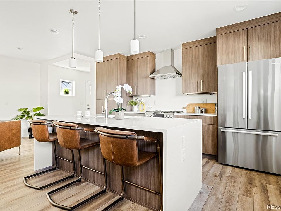 Brand new construction in Sloan's Lake with exquisite attention to detail and design. Sophisticated modern layout with warm tones, high ceilings and light filled spaces. Designed by Denver's renowned Real Architecture and complimented by staging from Schross Haus the high design elements are oozing with style and substance. With three bedrooms, three full bathrooms plus powder room, loft/entertainment area, two car garage, 2 off street parking spaces plus three outdoor escapes, this home has so much to offer. The sumptuous main level opens to the living, kitchen and dining room centered by a large quartz waterfall island and bar seating. Chef like a professional on Bosch stainless appliances with gas stove/exhaust hood and microwave drawer oven. Entertain with ease in this wonderful indoor/outdoor setup turf grass included for the fur babies. A large sliding glass door leads to your private patio for dining al-fresco at a moment's notice. Head upstairs to the large primary bedroom with serious knock-your-socks-off walk-in closet and 150+ sq ft bathroom. Separate vanity sinks, private lavatory, soaking tub and large custom shower perfectly appoint this spa-like bathroom. Enjoy morning coffee on your private balcony. The laundry room just outside the primary offers so much convenience. Across the hall is another bedroom with ensuite bathroom and large closet. On the upper level you will find the third bedroom with full bath and a loft area with built-in wet bar. The sweeping mountain views from your wraparound rooftop deck are perfect for Colorado sunsets. Stroll two blocks to Sloans Lake for year round recreation and all the restaurants, bars, breweries and food halls this neighborhood is known for. So close to downtown Denver, Mile High Stadium, lightrail station, bike trails and highway access to the mountains. No HOA! Lives like a single family home with only a small 5 foot attachment to the historic bungalow on the front of the lot. Builder Warranty Included.