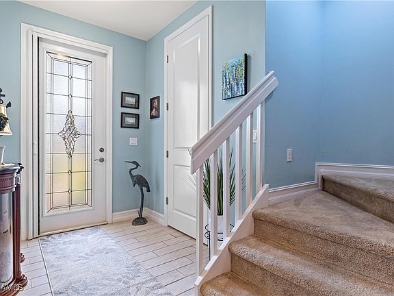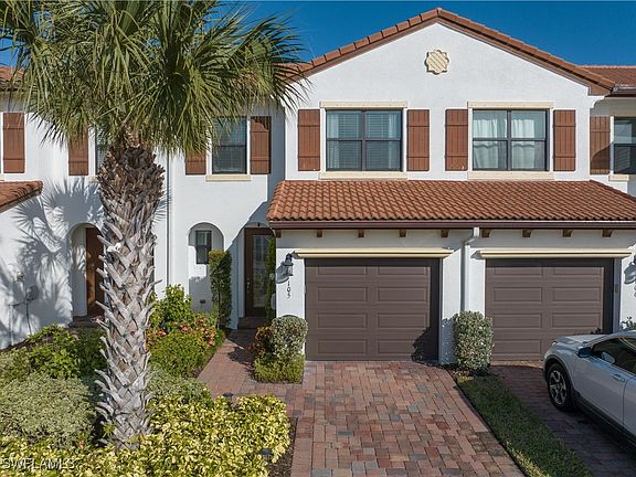Located in the pristine community of townhomes in Villa Medici of Fort Myers, get ready for an immaculate new vacation or staycation home complete with garage and paver driveway, a community pool, clubhouse and exercise room! Enter a serene environment done in soft coastal colors of creams, blues and light tile floors all enhanced by white trims throughout. The great room floor plan offers a large entryway, powder room, ample seating for relaxing and a formal dining area. Kitchen highlights include an abundance of storage via the white, raised panel door cabinets. Granite counters, newer stainless appliances, pendant lighting and a breakfast bar compliment the kitchen. A versatile dinette space is used for light office work. Enjoy outdoor time on the screened, extended lanai via the great room which offers space for outdoor dining. Upstairs features light carpeted floors, a large master suite with walk-in closet, full bath including soaking tub, walk-in shower and long, dual sink vanity with lots of storage. 2 guest bedrooms share a guest bath with long vanity, single sink and a tub/shower. The laundry closet including a stackable, front load washer and dryer completes the upstairs space. This unit experienced no flooding during the recent hurricanes.