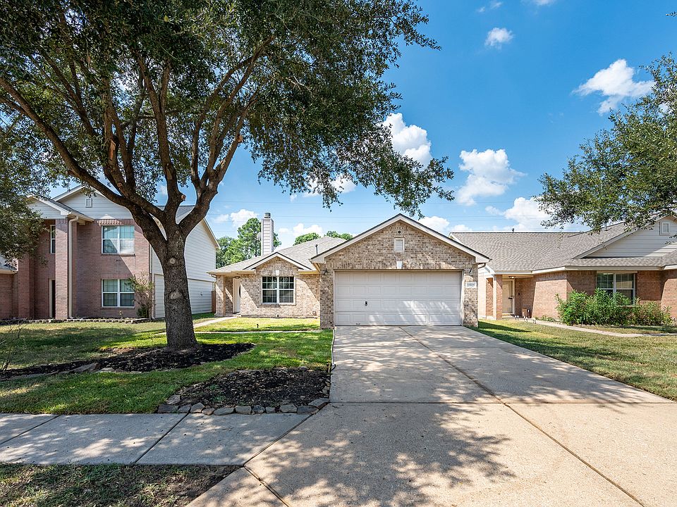Welcome home! This charming 1-story home offers 3 spacious bedrooms, 2 bathrooms, a 2-car garage, plus a versatile bonus room that's perfect for a formal living, home office, or playroom. The spacious family room features a cozy center fireplace, and the bright open floor plan includes beautiful wood laminate floors throughout most of the home, with tile in the primary suite and bathrooms. Primary suite comes with a standing shower and soaking tub, with brand new cabinet (soon). Large eat-in kitchen with an island for extra prep space. Step outside to relax on the huge covered patio with 2 ceiling fans, overlooking a large backyard and back to green space (no back neighbors), complete with a storage shed for all your extras. The home comes move-in ready with a refrigerator, and pets are welcome too! Zoned to top-rated Cy-Fair ISD schools and conveniently close to shopping, parks, and schools, this home truly has it all.