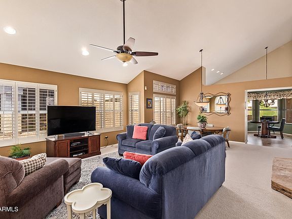 GOLF COURSE LOT! Fantastic opportunity to own this 3-bed, 2-bath home! Displaying a 2-car garage, a desert landscape. Inside, you'll find a welcoming living/dining room, neutral & earth tones, abundant natural light, vaulted ceilings, and a blend of carpet & tile flooring in all the right places. The eat-in kitchen showcases Stainless Steel appliances, granite counters, a pantry, & an island w/a breakfast bar & nook. The primary bedroom hosts direct access to the backyard, a private bathroom w/ dual sinks, a separate shower/tub & a walk-in closet. The backyard offers a covered patio, a sparkling pool, and ample room for gatherings all set against the backdrop of beautiful golf course and mountain views for a relaxing and scenic outdoor experience. Make this gem yours now!