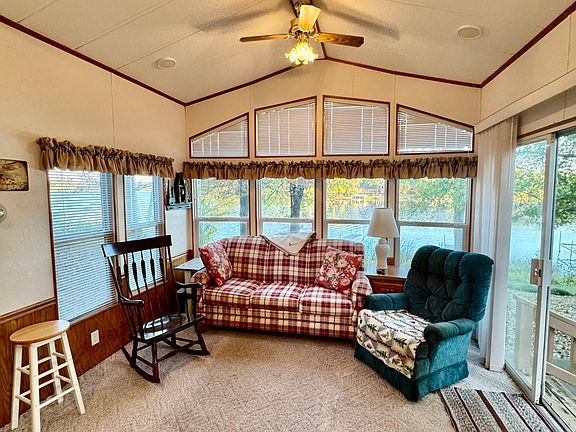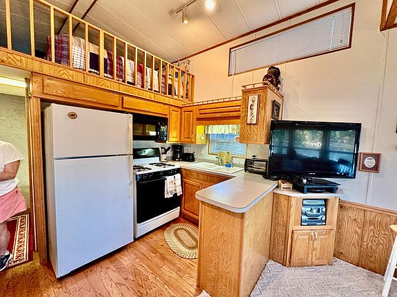 Furnished park modelWood floorsCozy patioLake viewsQuiet roadVaulted ceilingsOpen floor plan