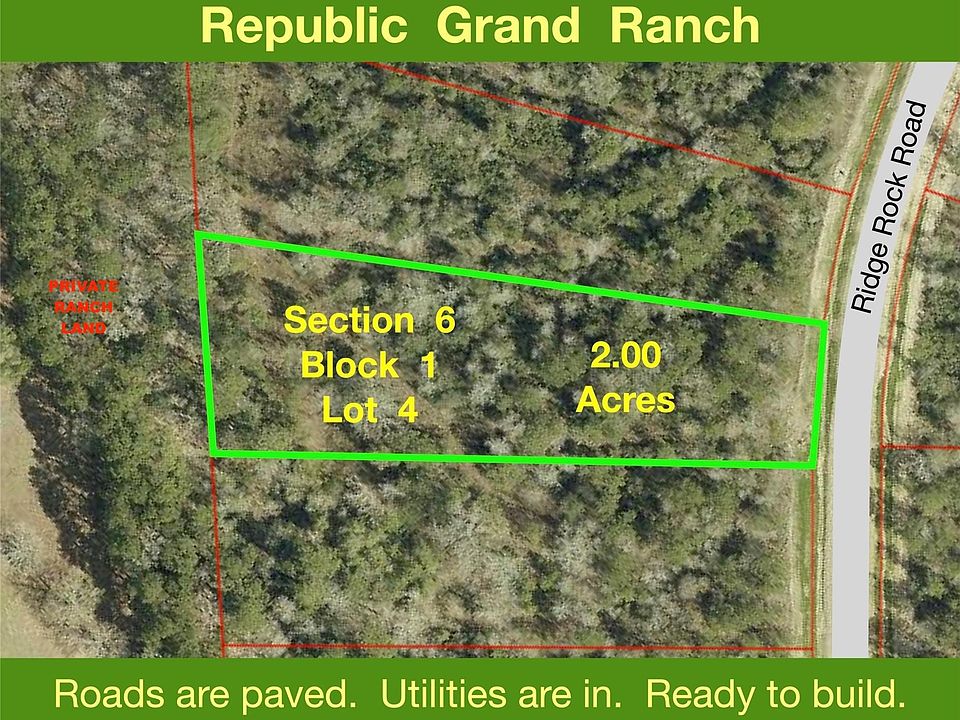 2.00 ACRES > HEAVILY WOODED >BACKS UP TO PRIVATE RANCH > LEVEL TERRAIN > Located on the outskirts of Willis with great schools and nearby shopping. Large lot wooded community with gentle rolling hills. Peaceful privacy. You will never be crowded by neighbors. Republic Grand Ranch is a large lot, wooded community in the rolling hills. Country lifestyle for your custom forever home. Trees, paved roads, water, HIGH SPEED fiber optic internet & underground power through out. Covered pavilions, parks, ponds, playgrounds, BBQ areas. Minutes from shopping, dining, schools, hospitals, and entertainment. Low taxes - No MUD tax. Average elevation is 400’ ASL. Plenty of greenspace and trails for hiking, biking and horseback riding.