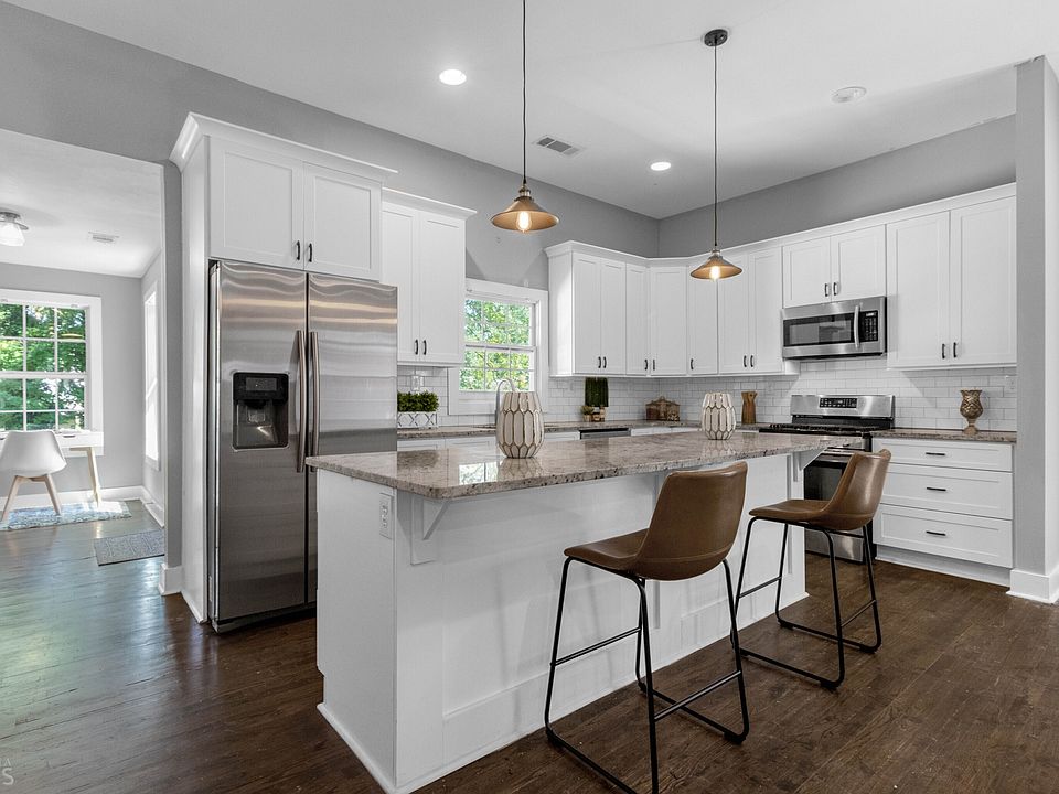- Features: Breakfast Area, Breakfast Bar, Kitchen Island, Pantry, Solid Surface Counters