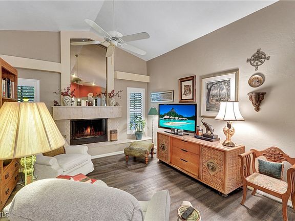 Comfort and casual living in this 3 BR, 2 Bath, split floorplan with Formal LR and DR (and that’s not to say you couldn’t convert this space to game room, sitting room or welcoming parlor), and anchoring the Family Rm with its Cathedral ceiling, is a timeless, wood burning fireplace, crackling away on those very seldom chilly winter nights. Kitchen has been updated, soft close drawers, under counter Lazy Susan cab, under cabinet lighting, newer SS appliances, a coffee/wet bar area. At the heart of the kitchen stands a versatile island, blending comfort and utility. Designed to serve as a welcoming breakfast bar, chef prep or serving station it’s illuminated by pendant lights casting a warm glow. Stretching over the counters is a tastefully selected Cambria quartz with neutral tones and clean lines. Tile and Vinyl flooring throughout, bathroom vanity updates, Plantation shutters throughout. Approaching this home, the stunning metal roof, installed in 2019, doesn’t go unnoticed.