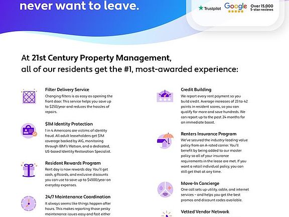 All 21st Century Property Management residents are enrolled in the Resident Benefits Package (RBP) for $50.95/month which includes liability insurance, credit building to help boost the resident's credit score with timely rent payments, up to $1M Identity Theft Protection, HVAC air filter delivery (for applicable properties), move-in concierge service making utility connection and home service setup a breeze during your move-in, our best-in-class resident rewards program and much more! To get the most out of the RBP residents can upgrade into our premium RBP package for ($65.95/month) which includes on-demand pest control. More details upon application.