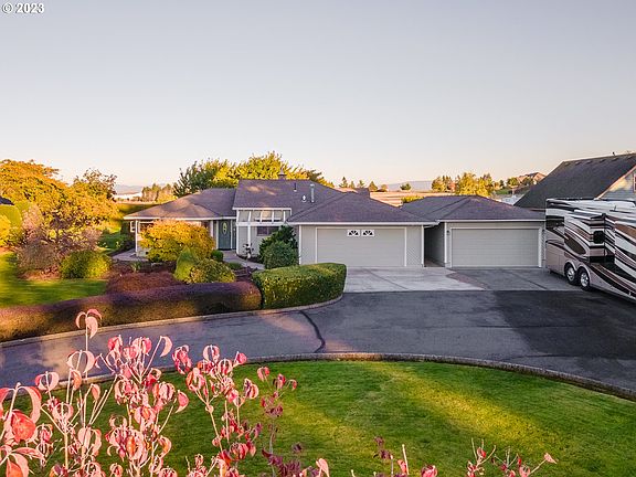Spectacular home in park like setting, hosts views of Mt. Hood on one side and Territorial views on the other. This meticulously maintained home has two separate primary suites. This sought after one level home is a stunner. 4 full bedrooms and 3 full baths. Separate primary living suite in adjacent structure. Gourmet kitchen, new air conditioner, yard and garden sprinkler system. Attached two car garage with additional detached oversized garage /shop totaling 3. Iron electric 18' entry gate with circular drive. RV Parking with 30/50amp service. Extensive patio in back to host beautiful Mountain view dinners. Listing agent related to sellers.
