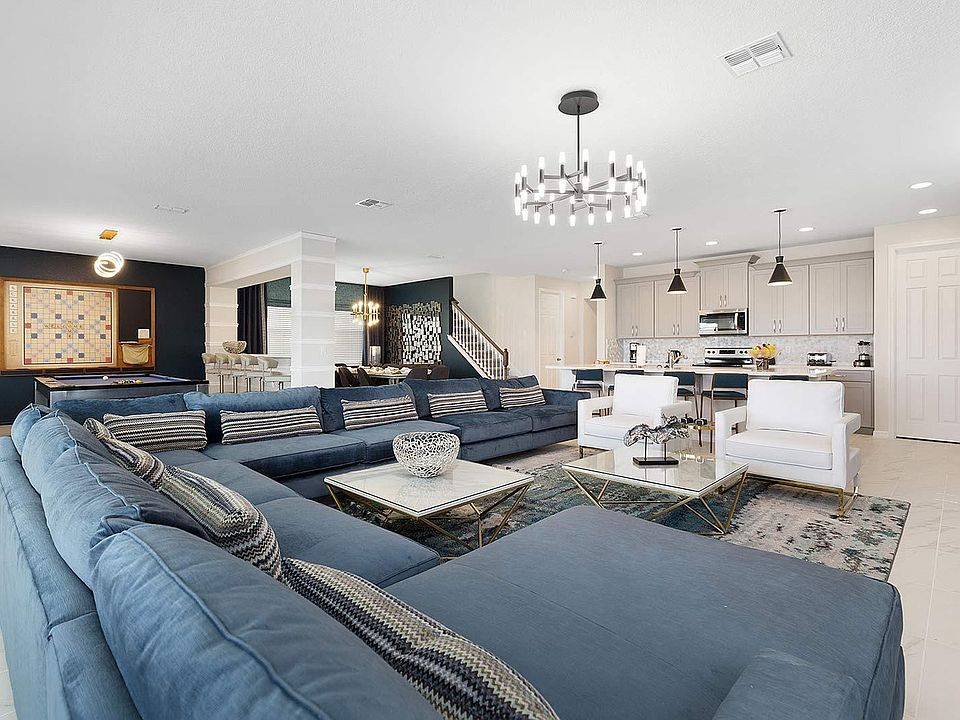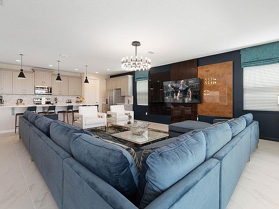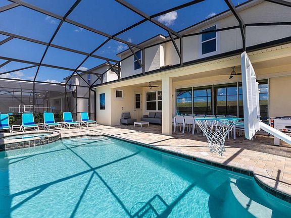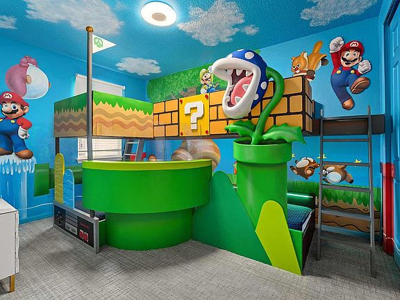 Step into a world of wonder with this enchanting Orlando home, where kids will be captivated by the Princess-themed bedroom, complete with glamorous decor and bunk beds, and life-sized princesses. Down the hall, the video game-themed bedroom offers incredible decor and furnishings that bring a real-world video game to life. The fun continues throughout the house, starting with the private home theater on the main floor, featuring 10 ultra-comfy leather recliners, LED lighting, a high-end projector and sound systems, and a giant projection screen. Enjoy arcade games like a Shelti Eye-Dart game and Power Putt in the theater. After movie night, head to the game room/loft, equipped with a karaoke system, arcade favorites like the Ice Ball and Funky Gators, a mini jungle gym for the little ones, and a lounge area with a smart TV. Just outside the back door, your private, screened-in pool and spillover spa await, surrounded by comfy loungers and a patio to bask in the warm Orlando sun. Wind down from the excitement with a delicious meal served at the 12-seat patio table overlooking the pool, and relax afterwards in the outdoor lounge area. An elegant indoor dining area is also available, complete with a large table, 14 chairs, and charming decor. The kitchen offers everything you need for mealtime, including a large fridge/freezer, oven, microwave, dishwasher, coffee maker, toaster, and cabinets stocked with cookware, dinnerware, and glassware. Shiny, white islands make prepping easy and double as a breakfast bar, bordered by 5 sleek stools. The living room is a great spot to chill out after an action-packed day, with soft, roomy couches or armchairs, a smart TV, and games like Ping-Pong or wall Scrabble adjacent to the living room. Pool and spa heat and BBQ grill rentals are available throughout your stay for additional fees. This home is equipped with one Pack n' Play and one high chair, with additional available for rent. The kitchen and bathroom are stocked with essentials to get you started. The driveway accommodates up to 2 cars with parking passes placed in the windshields, and additional parking lots for up to 3 more cars are available on each street on a first-come, first-serve basis. Located in the exclusive Solara Resort, this home offers Orlando's finest in luxury and entertainment. Enjoy myriad activities at the resort's state-of-the-art central clubhouse, including a FlowRider Surfing Simulator, splash parks with water slides, a heated Grand Pool, volleyball and basketball courts, soccer fields, walking trails, and a full-service fitness center. The kids can enjoy hours of fun in the teen center, complete with a multi-sport simulator. Varied dining options, including a full-service restaurant, are also available on the resort, with many more options nearby. Plus, just miles from Disney and other popular attractions like Universal Studios and Sea World, Solara offers everything you need to ensure the most memorable and magical vacation getaway for the whole family. This property is not owned, promoted, affiliated with, or endorsed by Walt Disney World Resort, SeaWorld, or Universal Orlando Resort.