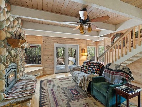 Stunning Private Retreat in Applegate Valley! 2-bed, 2-bath home surrounded by forest & bordered by two year-round creeks (w/ some water rights—buyer to verify). Living room w/ beamed ceilings, rock fireplace & glass doors to expansive deck. Kitchen w/ granite countertops, island w/ eat bar & breakfast nook. Main-level bedroom w/ beamed ceilings & deck access. Upstairs bedroom w/ vaulted ceiling, fireplace, deck access & bath w/ jetted tub. Detached art studio w/ garage, power & wood stove. Two-story storage building w/ wood stove, offering potential for additional living or work space. 2,500+ sq ft of decking, raised garden beds, 10 flower beds, fruit trees, hot tub, fire pit. Water softener & replaced well head (2017). Nearby ATV trails, hunting, fishing & Applegate Lake. BLM land nearby, irrigation rights to neighboring properties & protected creek (no building allowed).